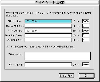 5.「FTP プロキシ」の項目に「192.168.0.1」を入力. 6.「ポート」の項目には「8080」を入力. 7.「HTTP プロキシ」の項目にも「192.168.0.1」を入力. 8.「ポート」の項目には「8080」を入力.