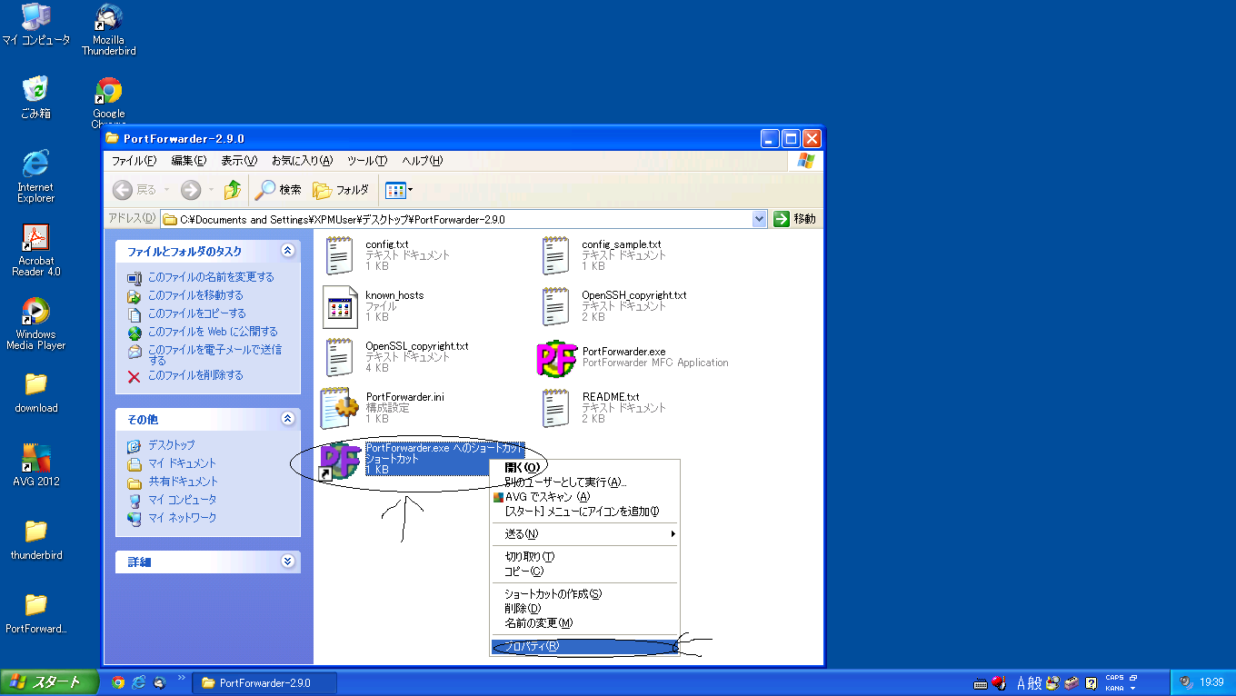 まず、PortForwarder.exe を右クリックして、「ショートカットの作成」をクリックする。