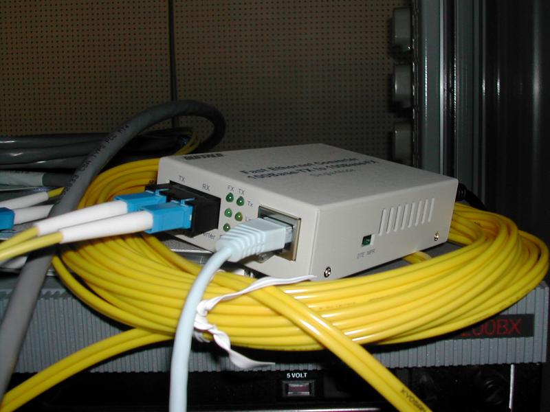 ルータからでた 100 Base-TX はこのメディアコンバータで 100 Base-FX に変換.