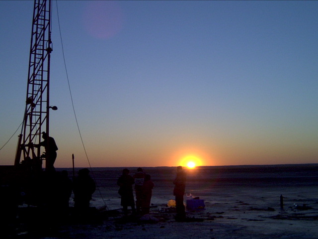 ダブス湖での堆積物コア掘削.地平線に沈む夕日.