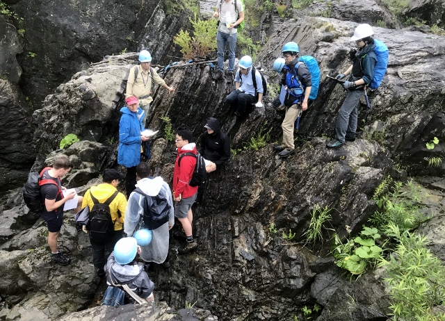 地球惑星科学セミナー(2年生必修科目): 大滝セミナーハウス(伊達市大滝)宿泊、実習.沢田担当.TA矢能さんが活躍. |