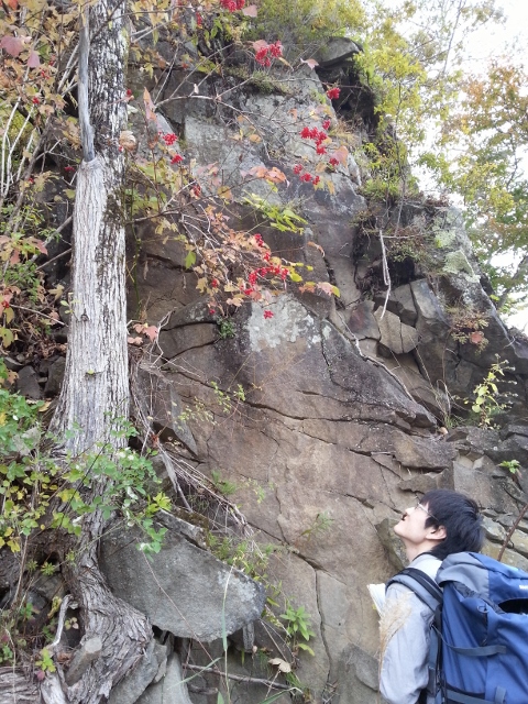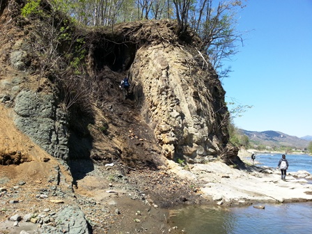 鵡川沿いの白亜系函淵層の露頭.舘下君が調査中.