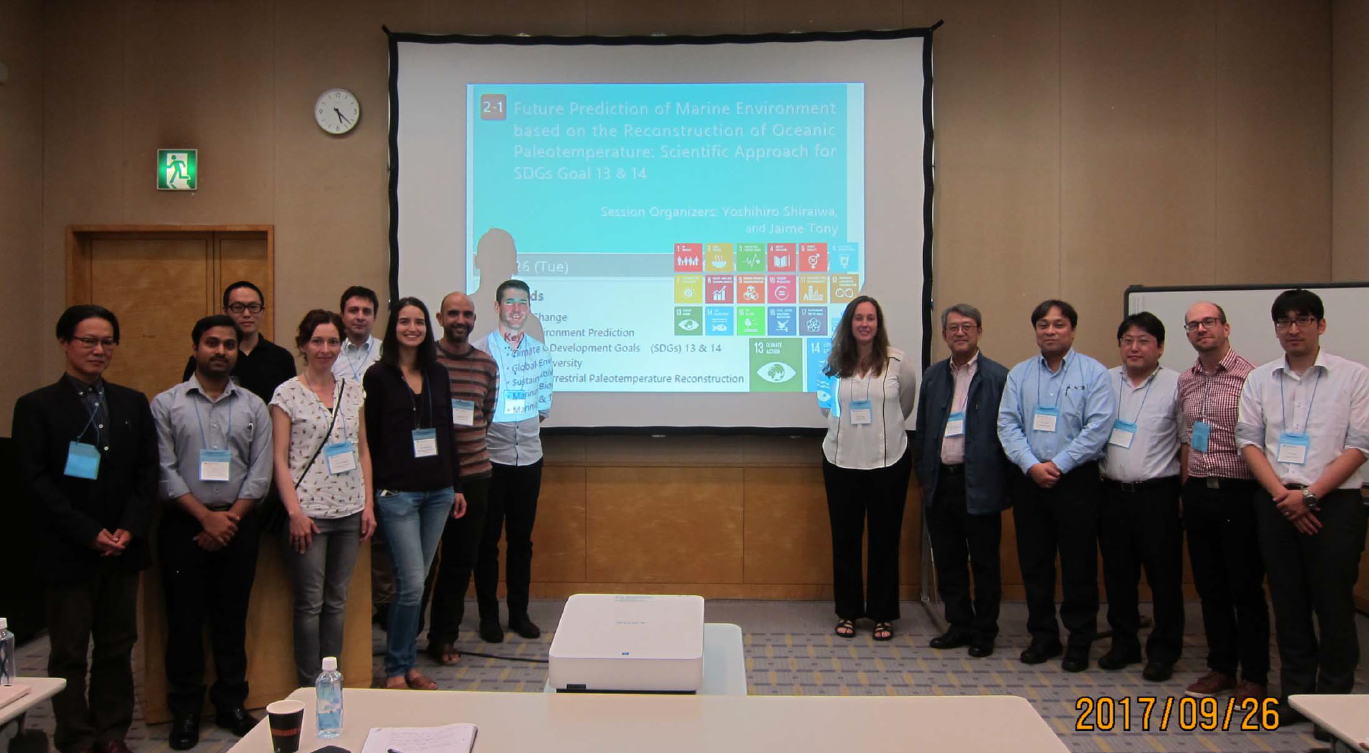 筑波大学国際シンポジウム2017: 有機分子古水温指標セッション (つくば国際会議場): Core session 'Future Prediction of Marine Environment based on the Reconstruction of Oceanic Paleotemperature'.筑波大白岩先生の呼びかけで、海洋において有機分子古水温指標を研究する若手研究者が集結してシンポジウムを行いました.グラスゴー大 Jaime ToneyさんやPlancqさん、NIOZ、グラナダ大などの若手が最新の話題・情報交換、討論を行いました.沢田と風呂田君が招待講演.アルケノンだけでなく長鎖アルキルジオール指標の内容が主流で、とても実のあるシンポ、交流会になりました.