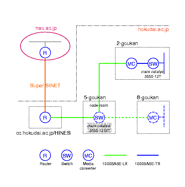 北大 Super SINET ノードから 5 号館ノード室までは光ファイバ (1000BASE-LX)